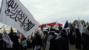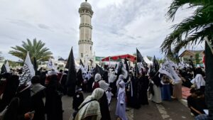 Di lokasi, massa sudah berkumpul di depan masjid sejak pukul 10.00 pagi WIB. Mereka memakai pakaian hitam yang notabene wanita sambil memegang umbul-umbul bendera hitam putih bertuliskan kalimat tauhid, begitu juga poster yang bertuliskan kecaman kepada zionis Israel. Massa yang hadir berasal dari Banda Aceh, Aceh Besar dan sebagian dari luar dua daerah itu seperti Meulaboh, Takengon dan Langsa.