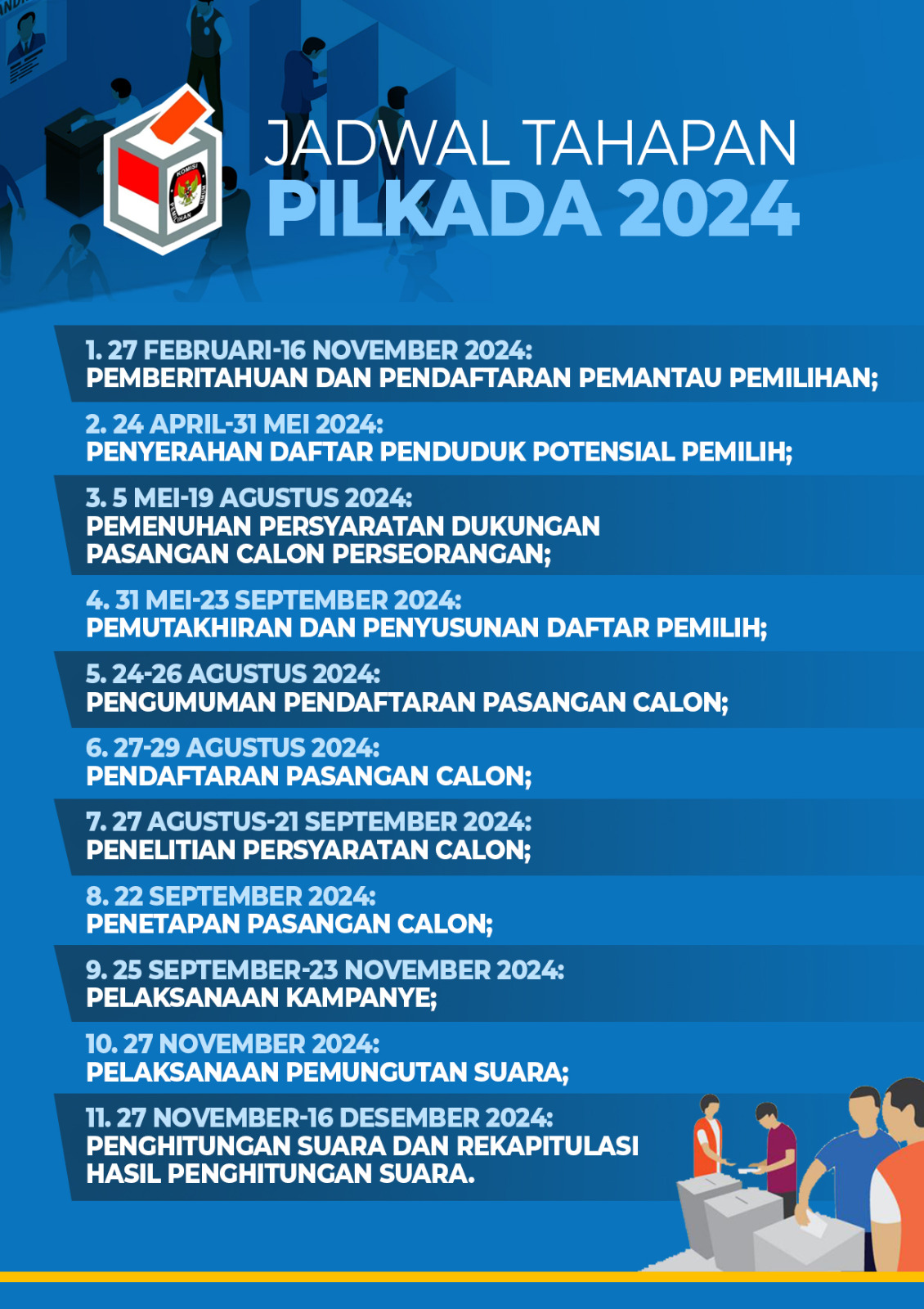 Sedangkan untuk gelaran Pilkada, Komisi Pemilihan Umum (KPU) melalui Peraturan KPU (PKPU) Nomor 2 Tahun 2024 tertanggal 26 Januari 2024 telah menetapkan, pelaksanaan Pilkada yang ditandai dengan pemungutan suara berlangsung serentak pada Rabu, 27 November 2024 di seluruh Indonesia.