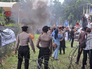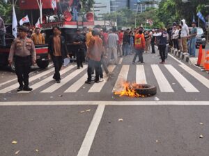 Suasana sempat menegang ketika massa mulai melakukan aksi bakar ban di dua titik berbeda. Api berkobar di depan barikade kawat duri yang membatasi massa dengan gedung KPK.