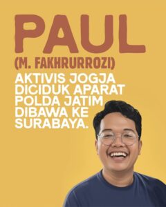 KN. Lagi-lagi polisi menangkap aktivis atas tuduhan menghasut kerusuhan pada Agustus 2025. Kali ini yang mereka sasar adalah Muhammad Fakrurrozi. Pria yang akrab disapa Paul itu adalah aktivis aksi Kamisan dan anggota tim kampanye Social Movement Institute. Polisi menuduh Paul punya andil dalam aksi demonstrasi yang berujung kerusuhan di Kota Kediri.
